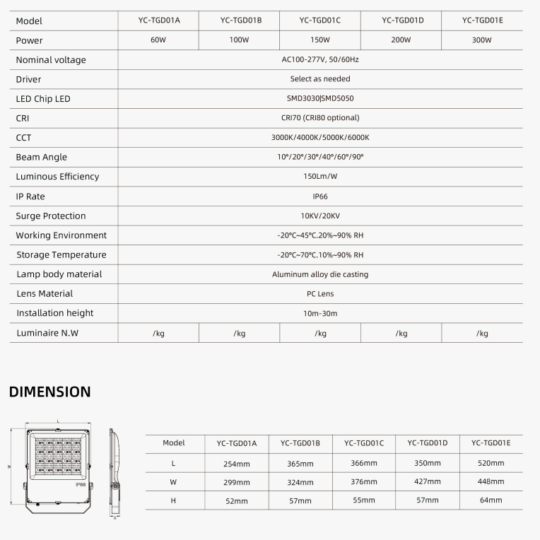 | YC-TGD01-50W | 358*294*52 | 50 w | Heat sink Aluminum body,Glass,Bracket,304 screws, PCB, lentë. |